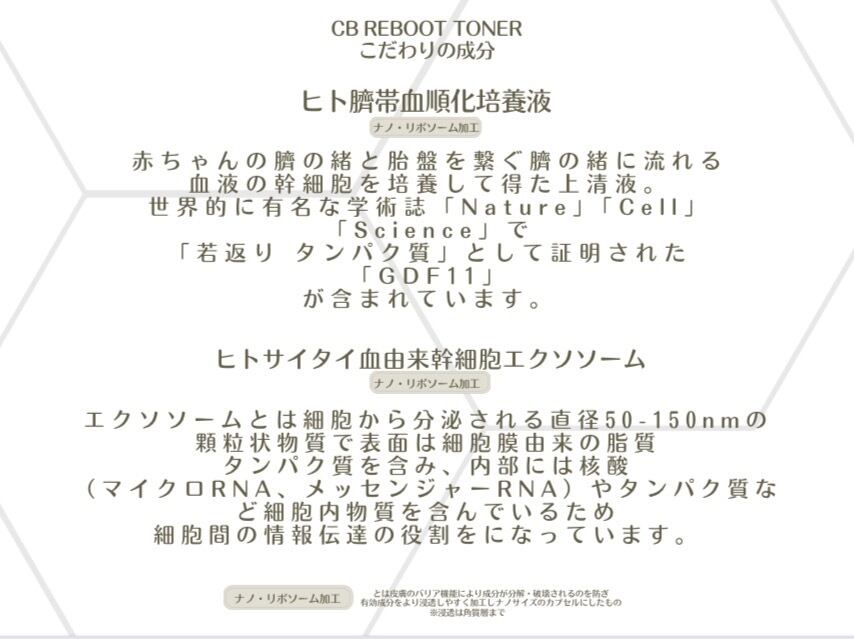 全成分/水、BG、グリセリン、ペンチレングリコール、1,2ーへキサンジオール、ヒト臍帯血細胞順化培養液、ヒトサイタイ血由来幹細胞エクソソーム、加水分解コラーゲン、ナイアシンアミド、グリチルリチン酸2K、シリカ、ヒアルロン酸Na、アロエベラ葉エキス、ヒメフウロエキス、ドクダミエキス、ツボクサ葉/茎エキス、ケイ酸Na、レシチン、水添レシチン、コレステロール、トコフェロール、クエン酸、クエン酸Na、カルボマー、水酸化K